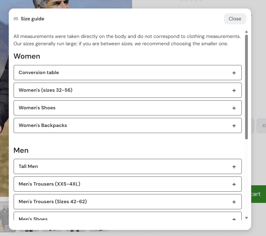 Through iterative testing, the size selection experience evolved from a complex, table-heavy interaction into a clearer, more accessible decision-making tool—directly improving user confidence and reducing friction at a critical point in the purchase journey